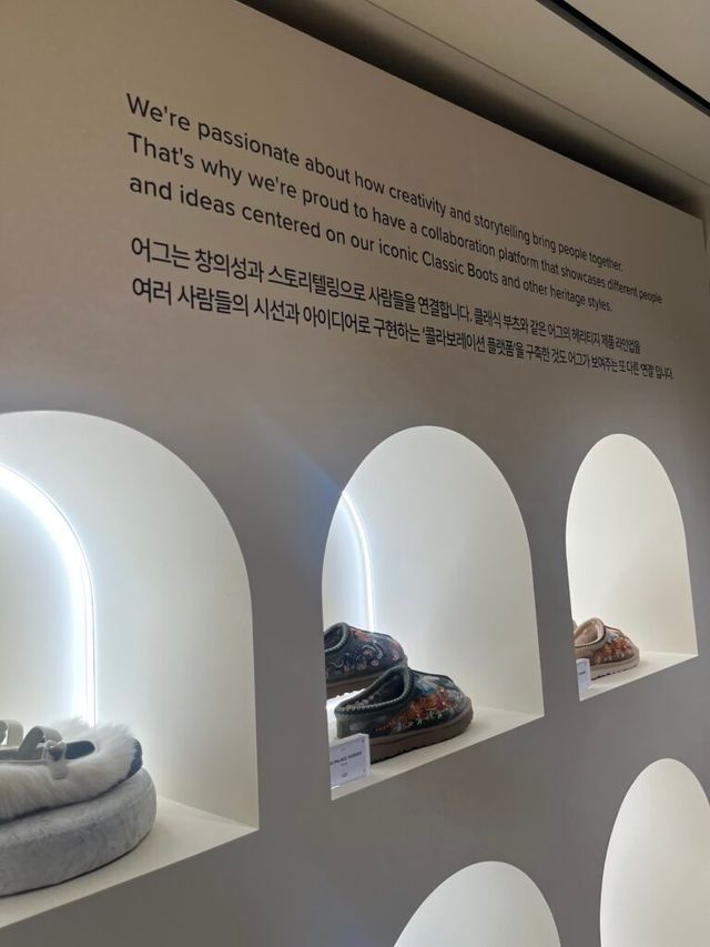 약 109평으로 국내 어그 매장 중 최대 규모를 자랑하는 어그 도산 플래그십 스토어만의 특별한 공간이 있습니다. 바로 매장 한쪽의 <커뮤니티존>이죠. 브랜드를 직접 경험하고 즐길 수 있는 체험형 콘텐츠와 문화 예술 커뮤니티와의 교류를 위한 프로그램이 운영됩니다. 현재는 갤러리 디파트먼트, 앰부시와 콜라보레이션한 과거 아카이브 제품들과 브랜드 ‘준태킴’ 과의 협업으로 만들어진 커스텀 어그가 전시되어 있습니다.