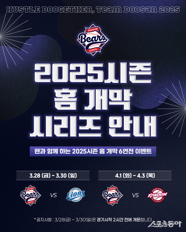 홈 개막 맞이 특별 팬 사인회도 진행한다. 내야수 강승호와 투수 최승용이 29일 오후 3시 30분부터 중앙출입문 옆 사인회장에서 팬들과 시간을 보낸다.