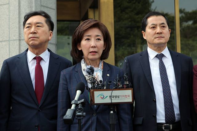 국민의힘 김기현, 나경원, 박대출 의원이 24일 오전 서울 종로구 재동 헌법재판소 대심판정에서 한덕수 국무총리 탄핵심판 선고 방청 후 밖으로 나와 입장을 표명하고 있다 / 뉴스1