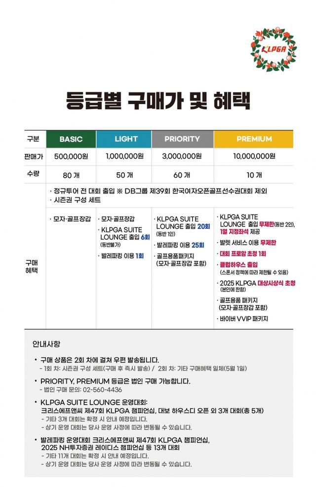 2025 KLPGA투어 시즌권은 올해 추가된 베이직(BASIC) 등급을 포함해 라이트(LIGHT), 프라이어러티(PRIORITY), 프리미엄(PREMIUM) 등 총 4개 등급으로 판매해 골프 팬들이 조건에 맞게 선택할 수 있다.