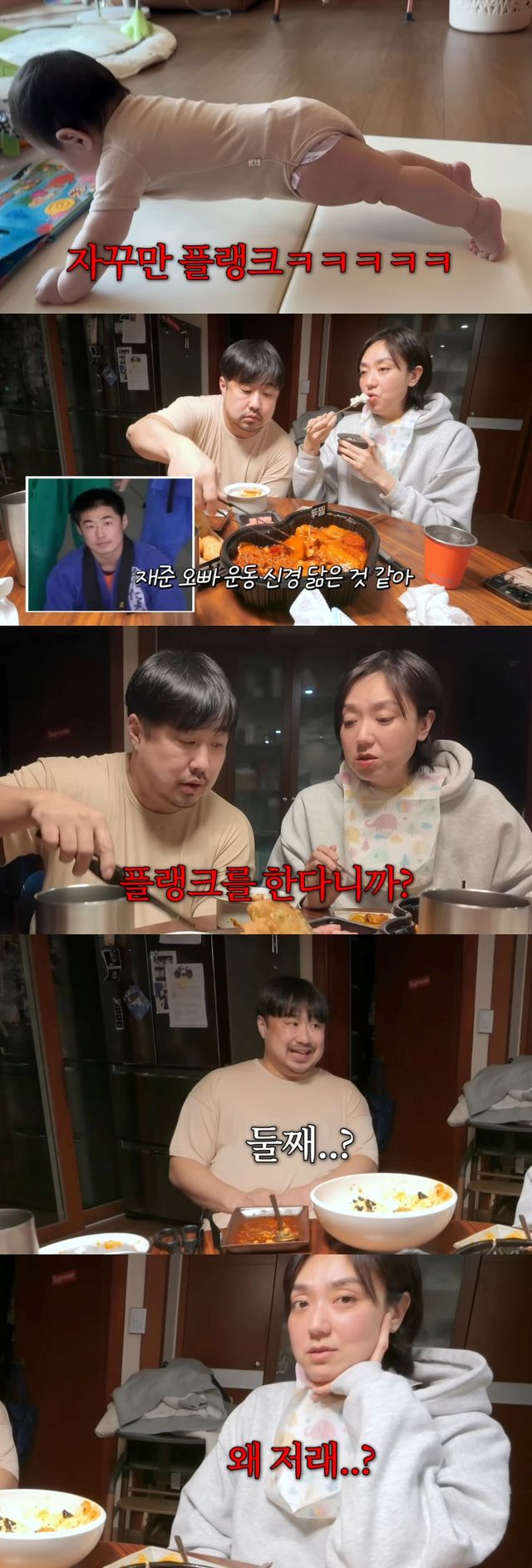 영상 속 두 사람의 아들 현조는 이제 겨우 7개월이 지났지만 플랭크를 거뜬히 소화하는 모습으로 엄마 이은형을 놀라게 했다. 무너뜨려도 쓰러지지 않고 튼튼하게 버티면서 남다른 근육을 자랑한 것.