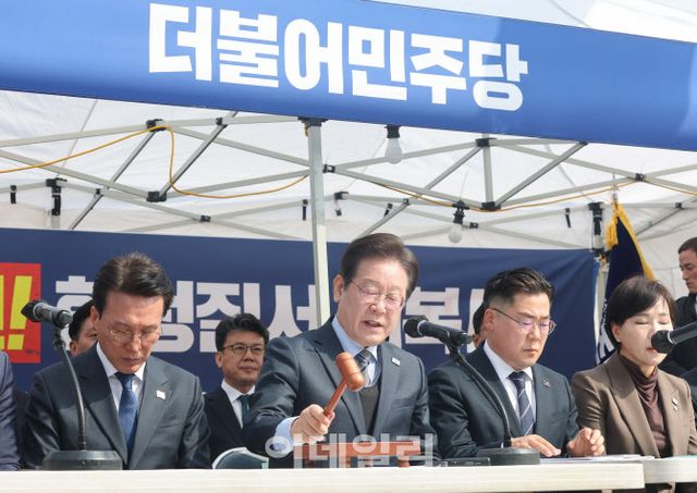 민주당은 24일 오전 서울 종로구 광화문 인근에 천막 당사를 설치한 뒤 최고위원회의를 열고 현판식을 진행했다. 민주당이 천막 당사를 세운 것은 2013년 국가정보원 대선 개입 의혹 규명을 위한 장외농성 이후 12년 만이다. 이재명 대표는 “민주당도 천막 당사라고 하는 비정상적인 조치를 하지 않을 수 없는 그런 상황에 이르렀다”면서 “12·3 계엄사태에서도 최하 5000에서 1만 명을 죽이겠다는 계획을 세웠고, 죽이는 방법조차 폭사, 독사 또는 사살 등 온갖 방법이 강구됐다. 다시 계엄이 시작될 수 있는 엄중한 상황에서 헌법재판소가 선고기일을 계속 미루는 것을 도저히 납득하기어렵다”고 했다.