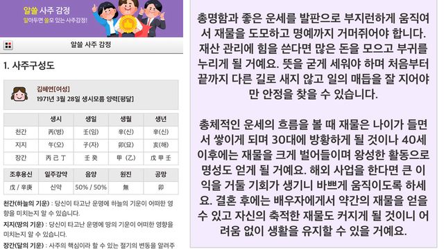 온라인 사주 전문 사이트 '위키사주'는 오랜 전통을 바탕으로 한 사주팔자와 현대적인 분석 기술을 결합하여 각자의 운명을 상세히 분석한다. 이름과 생년월일, 태어난 시간과 성별을 입력하면 간단하게 이용할 수 있다. 만사형통 내 운명의 비밀 사주, 쓸모있는 사주 감정, 복잡한 세상 편하게 사는 소름돋는 비법 사주까지 다양한 운세를 재미있게 점칠 수 있다.