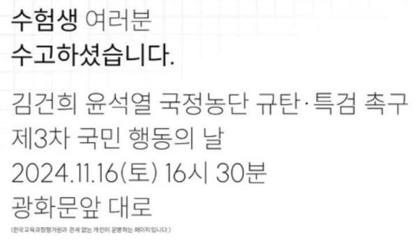 웹페이지에는 ‘수험생 여러분 수고하셨습니다’라는 인사말과 함께 ‘김건희, 윤석열 국정농단 규탄·특검 촉구 제3차 국민 행동의 날’이라는 문구가 적혔다. 또 ‘한국교육과정평가원과 관계없는 개인이 운영하는 페이지입니다’라는 내용도 있었다.