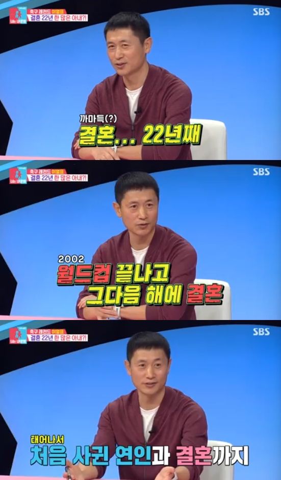 이날 이영표는 "결혼 22년차다. 2002 월드컵 끝나고 그 다음 해에 했다. 그 당시에 제가 26살이었다"면서 "아내가 첫사랑이다. 처음 사귄 여자친구였는데, 결혼까지 했다. 첫사랑이자 마지막 사랑"이라고 했다.