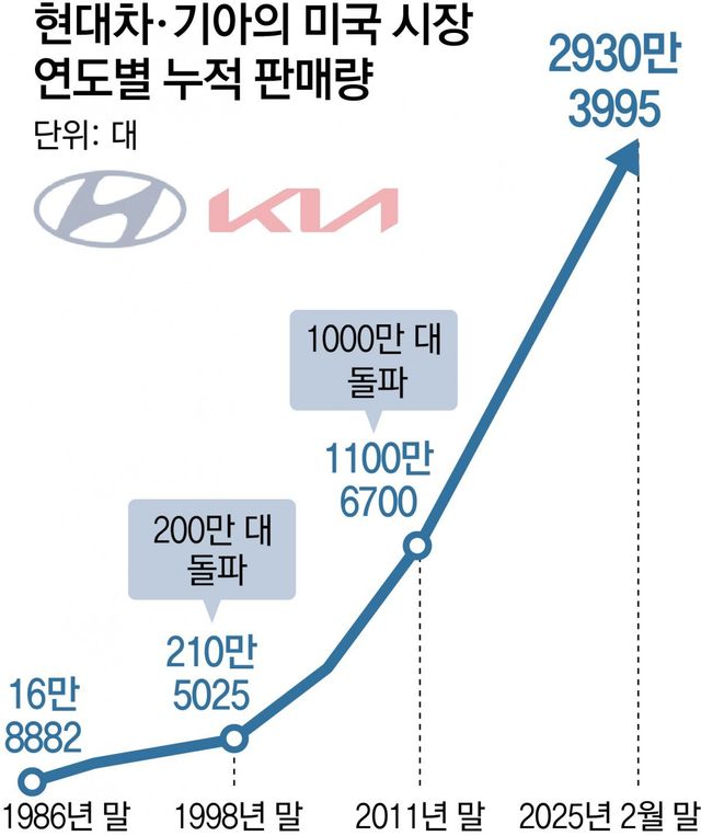 현대차와 기아는 일찌감치 적극적인 현지화 전략으로 미국 시장을 공략해 나갔다. 기아는 1992년 미국 판매법인을 설립한 뒤 1994년 세피아, 스포티지를 판매하며 초석을 다졌다. 이어 2005년 현대차 앨라배마 공장, 2010년 기아 조지아 공장을 설립하며 미국 현지 생산 체계를 마련했다.