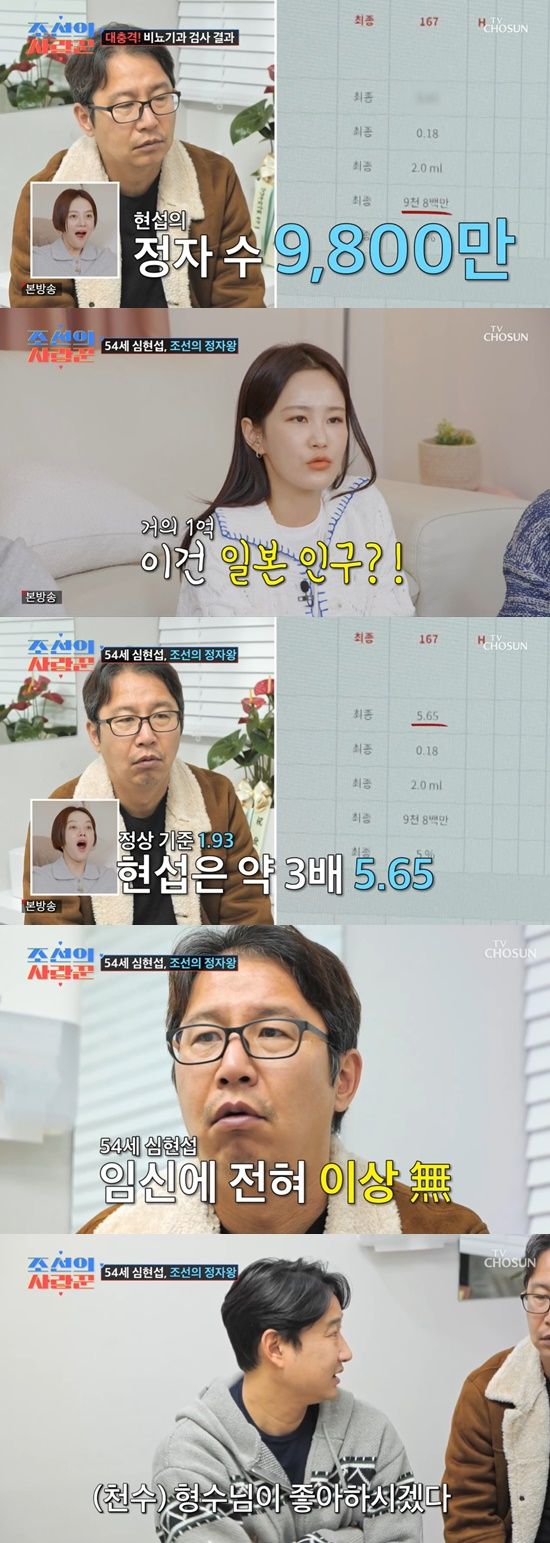 의사는 "개원이래 정자수 1등"이라고 언급했고, 심지어는 남성호르몬 수치도 동나이대 대비 3배나 높아 모두를 경악케 했다. 이에 김국진은 "현섭이 지금까지 뭐한거야"라고 말했고, 황보라는 "멋져보여 갑자기"라고 반응했다.