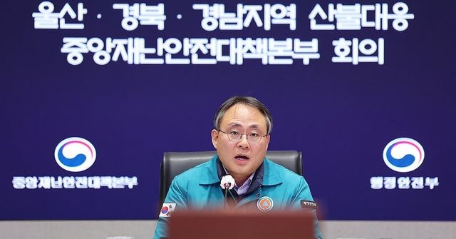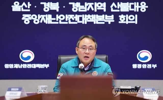 고기동 행정안전부 장관 직무대행이 22일 정부서울청사에서 울산·경북·경남지역 산불 대응 중앙재난안전대책본부 회의를 주재하고 있다. / 연합뉴스