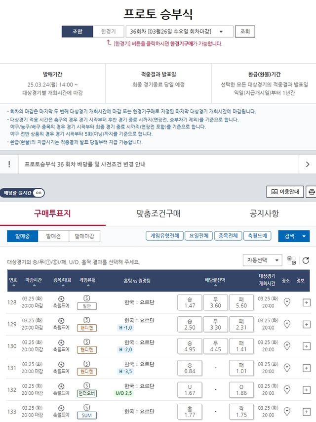 이번 프로토 승부식 36회차에서 한국-요르단전을 대상으로 하는 경기는 ▲일반(128번) ▲핸디캡(129번) ▲핸디캡(130번) ▲소수핸디캡(131번) ▲언더오버(132번) ▲SUM(133번) 등의 다양한 유형으로 즐길 수 있다.