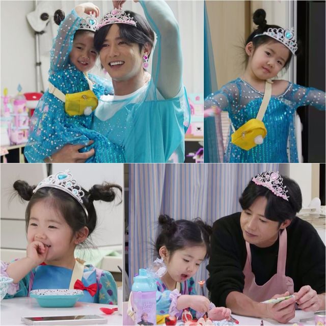 이날 방송에서는 오종혁의 역대급 ‘딸 사랑’이 펼쳐진다. 공주에 푹 빠져있는 로지를 위해 해병대 출신의 ‘강철 아빠’ 오종혁이 과감히 왕비로 변신한 것. 공개된 스틸 속 오종혁은 로지와 똑같은 파란색 쉬폰 드레스와 화려한 왕관까지 장착한 모습으로, 우아한 종혁 왕비와 깜찍한 로지 공주의 모습이 유쾌한 부녀 케미를 발산해 시선을 사로잡는다. 특히 오종혁은 넓은 어깨로 인해 드레스가 잠기지 않는 반전 뒤태로 웃음을 선사했다는 후문.