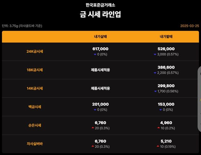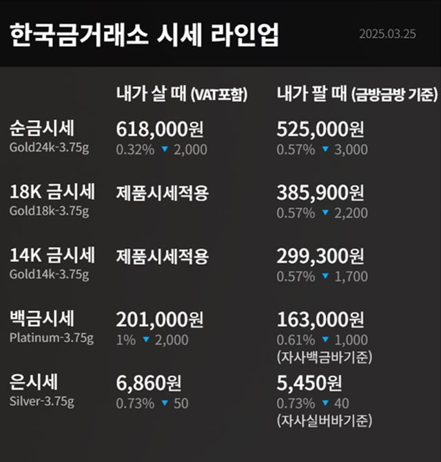 순금(24K) : 매입가 61만 8000원 / 매도가 52만 5000원