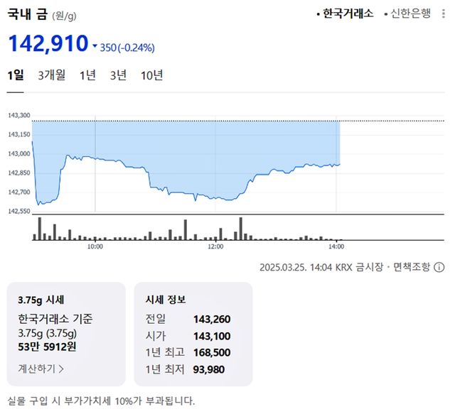 국내 금시세(금값)가 25일(한국 시각) 오후 하락세(전 거래일 대비)를 보이고 있다.