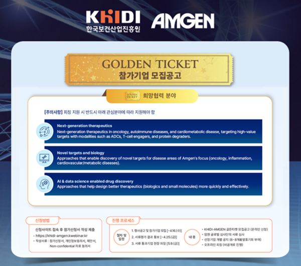 [메디먼트뉴스 이상백 기자] 암젠코리아(대표 신수희, 이하 암젠)와 한국보건산업진흥원(원장 차순도, 이하 ‘보산진’)은 국내 제약·바이오 산업의 혁신을 지원하기 위해 오픈 이노베이션 프로그램인 ‘2025 보산진-암젠 골든티켓(Golden Ticket)’의 온라인 참가 신청 접수를 시작한다. 참여 신청은 3월 19일부터 4월 16일까지로, 공식 웹사이트를 통해 진행된다.