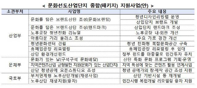 올해 선정된 3개소의 문화선도 산단에는 산단의 주력업종·역사성 등을 반영해 산단 통합 브랜드를 구축하고, 이를 바탕으로 문체부 산단 특화 문화프로그램 지원사업, 산업부 구조고도화사업, 국토부 노후산단 재생사업 등 관계부처 사업을 종합적으로 지원한다.