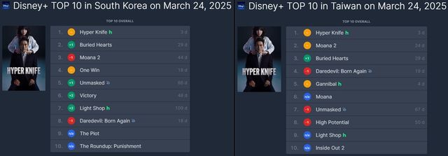 지난 24일 글로벌 OTT 플랫폼 시청 순위 집계 사이트인 FlixPatrol(플릭스패트롤)에 따르면 ’하이퍼나이프’는 한국과 대만에서 3일 연속 디즈니+ 콘텐츠 종합순위 1위를 기록하며 독보적인 인기를 입증했다.