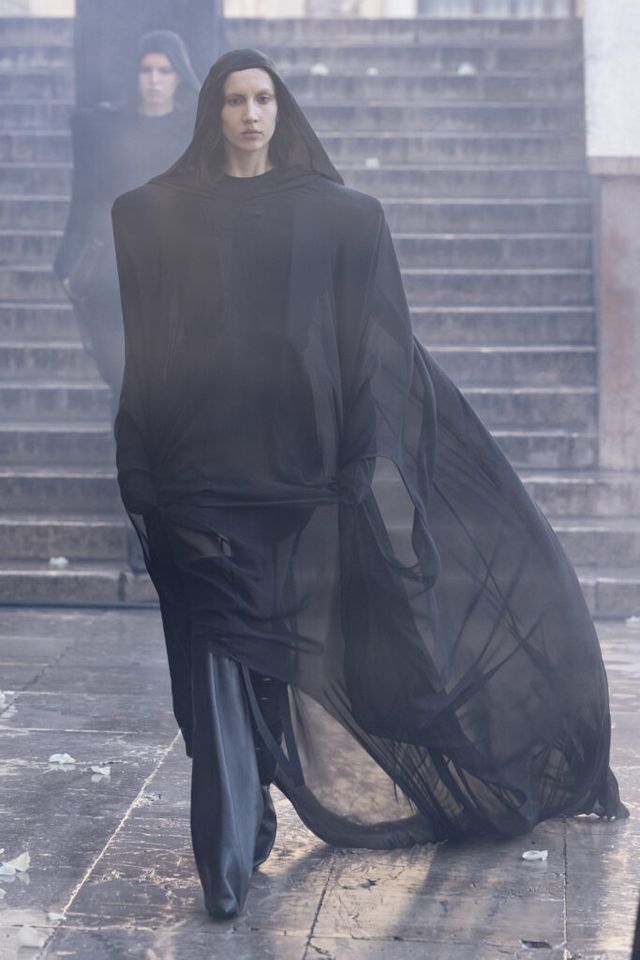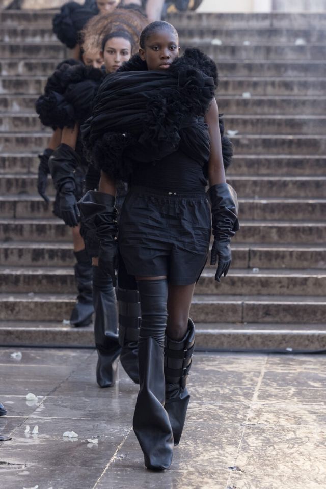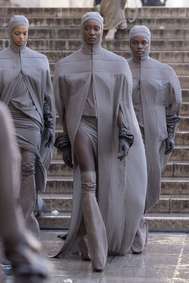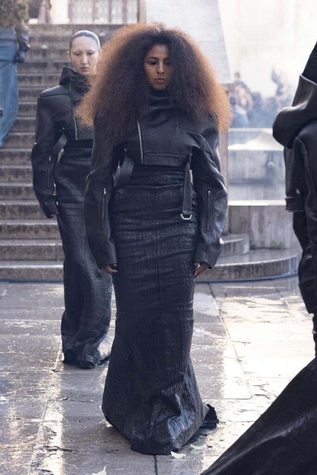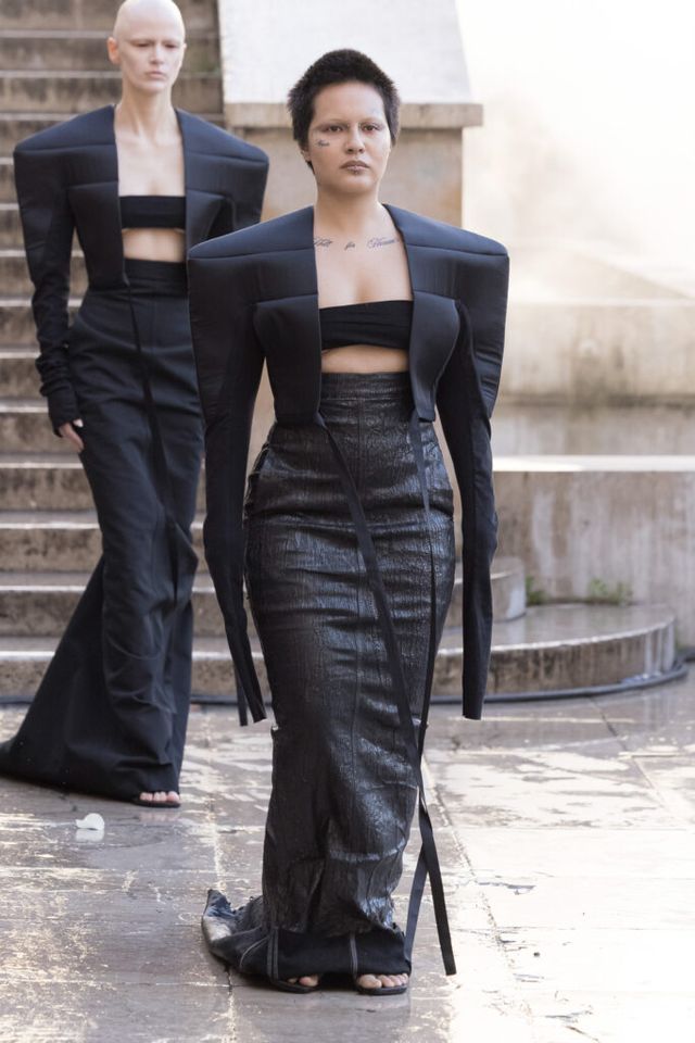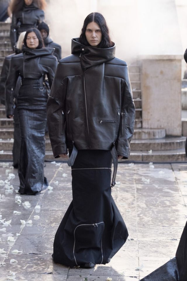 NOTE 지난 6월, 맨즈 컬렉션에서 파리의 여러 패션 스쿨에 재학 중인 학생 2백여 명을 런웨이에 세우며 ‘사랑의 군단’을 통솔했던 릭오웬스는 이번에도 그 맥을 이어갔다. 시그니처인 과장된 어깨 라인, 풍선 부츠, 얇은 명주 스톨 등 누가 봐도 ‘릭 오웬스스러운’ 차림새를 한 10여 명의 전사들이 무리 지어 걸어 나왔고, 치렁치렁한 치맛자락을 바닥에 끌며 런웨이를 장악했다. 쇼 베뉴인 팔레 드 도쿄 건물 위에서는 릭 오웬스 신전의 사도들이 꽃가루를 뿌리며 쇼에 드라마틱한 분위기를 더했다.