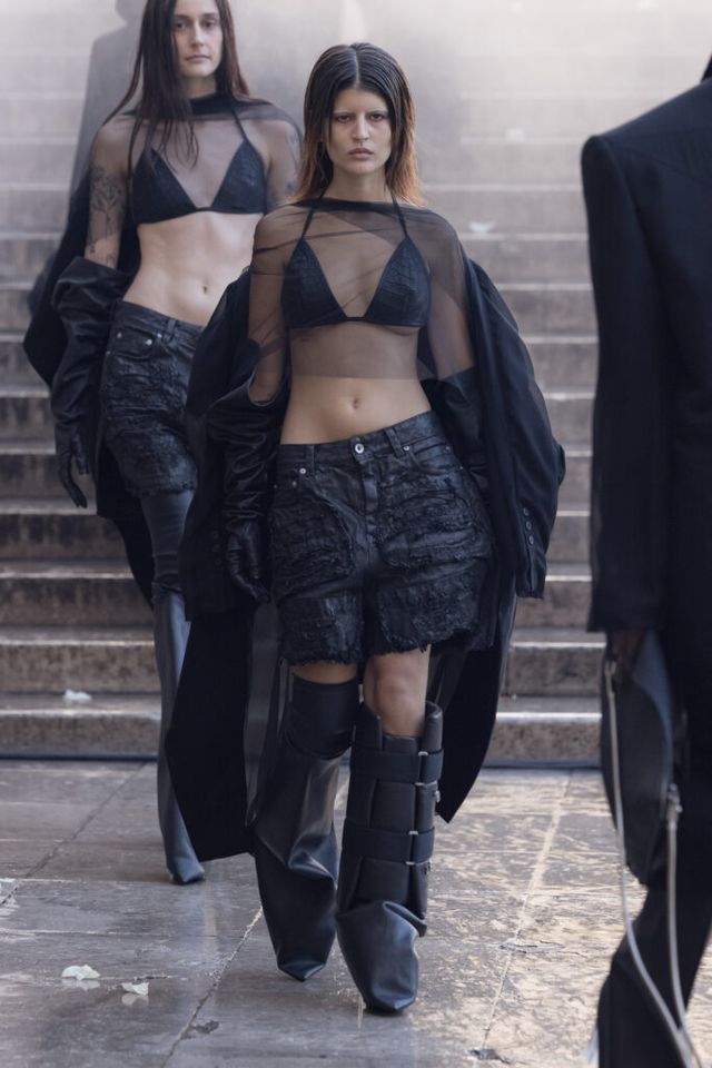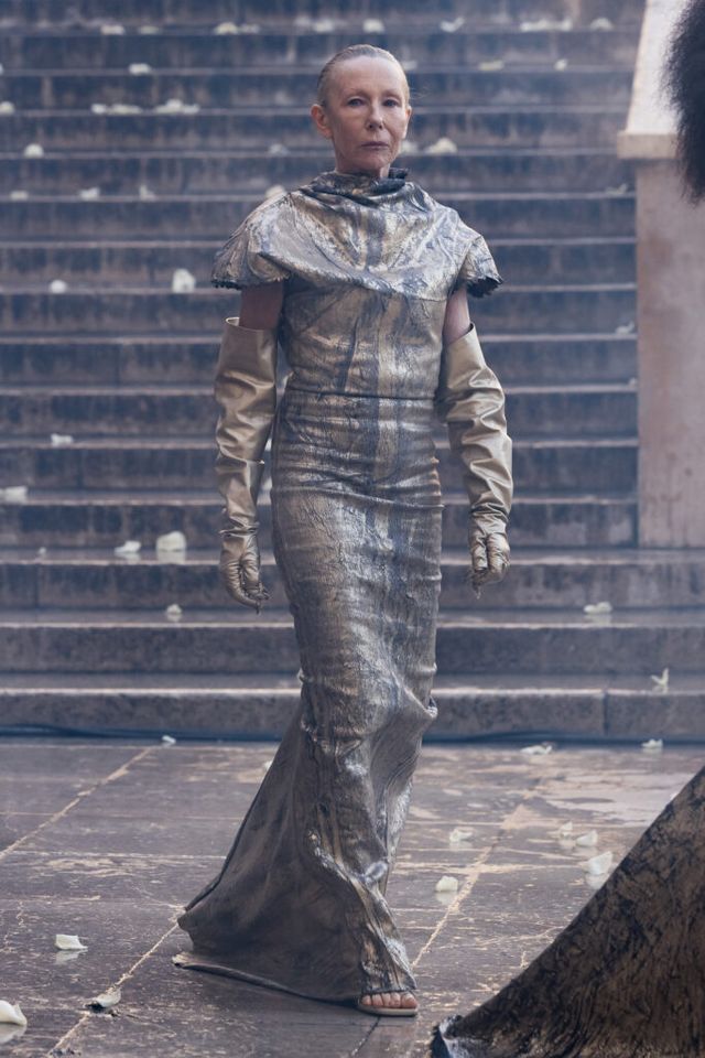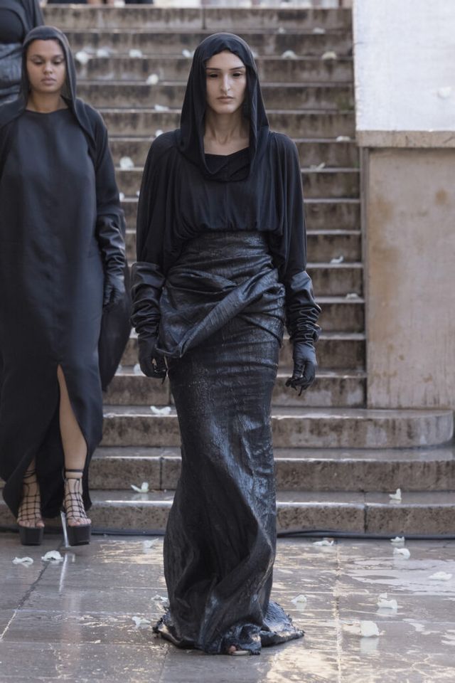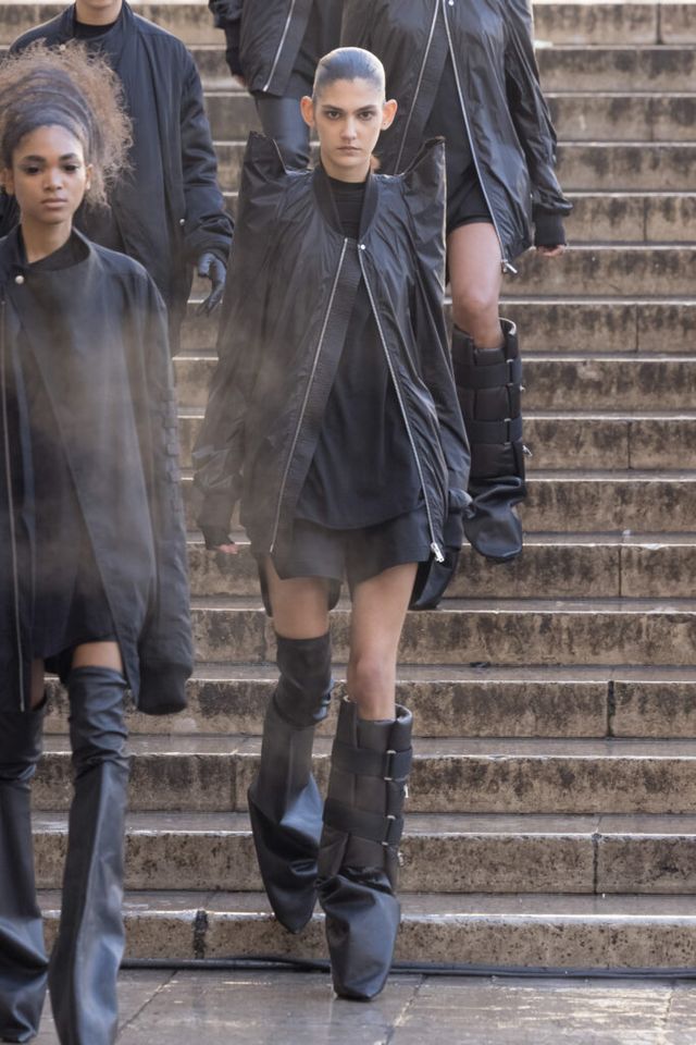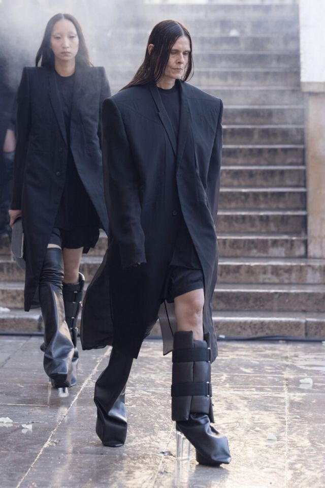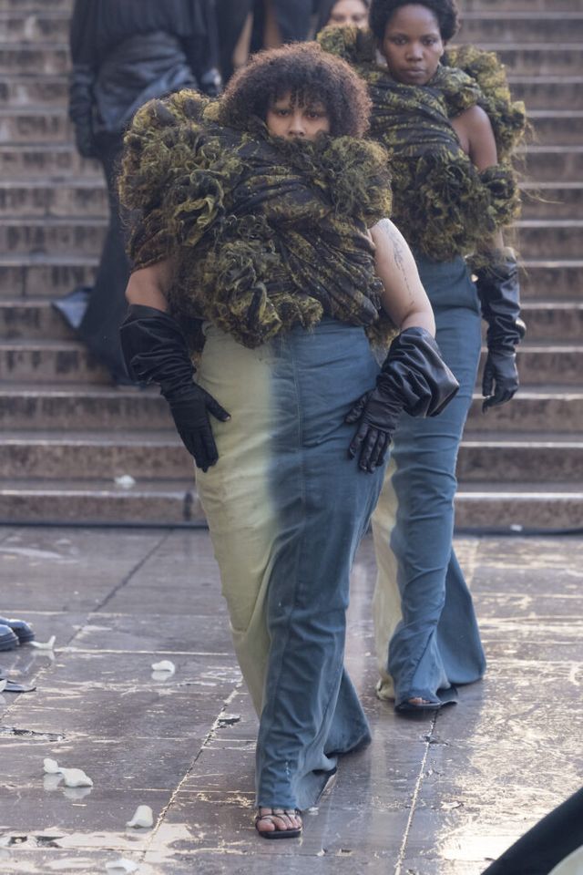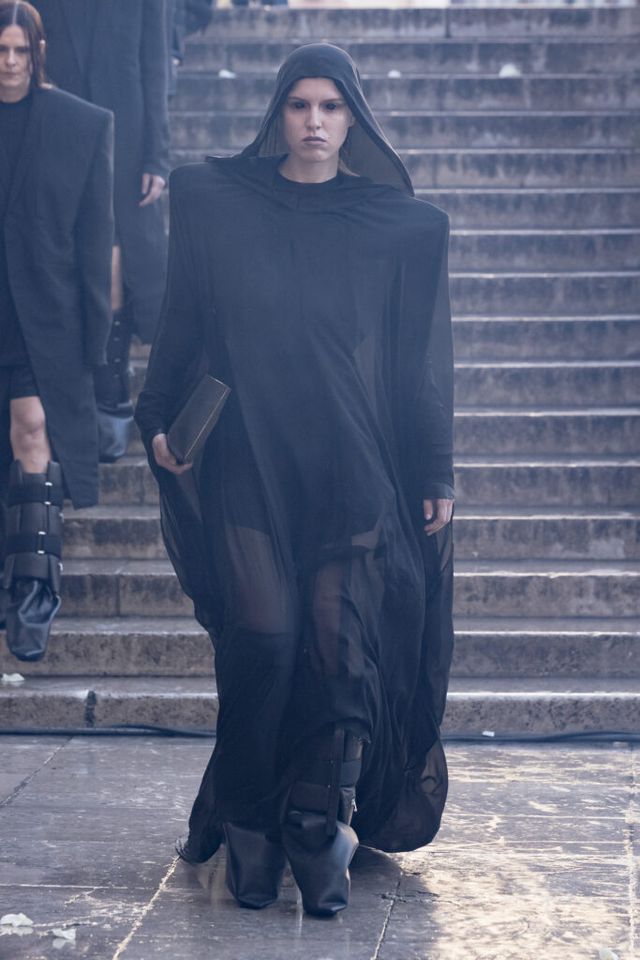 NOTE 지난 6월, 맨즈 컬렉션에서 파리의 여러 패션 스쿨에 재학 중인 학생 2백여 명을 런웨이에 세우며 ‘사랑의 군단’을 통솔했던 릭오웬스는 이번에도 그 맥을 이어갔다. 시그니처인 과장된 어깨 라인, 풍선 부츠, 얇은 명주 스톨 등 누가 봐도 ‘릭 오웬스스러운’ 차림새를 한 10여 명의 전사들이 무리 지어 걸어 나왔고, 치렁치렁한 치맛자락을 바닥에 끌며 런웨이를 장악했다. 쇼 베뉴인 팔레 드 도쿄 건물 위에서는 릭 오웬스 신전의 사도들이 꽃가루를 뿌리며 쇼에 드라마틱한 분위기를 더했다.