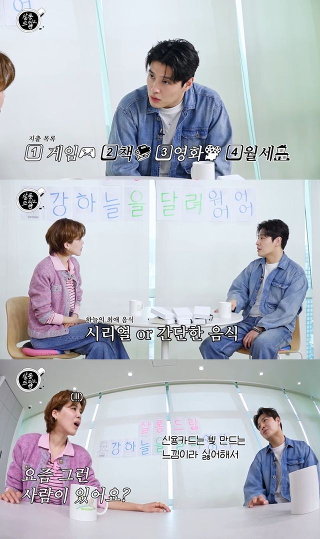 장도연은 강하늘에게 "카드값 진짜 얼마 안 나오겠다"라고 말하자 강하늘은 "제가 체크카드밖에 안 쓴다. 신용카드는 빚 만드는 사람 같아서 좀 싫어한다"라고 말하며 "조금 찝찝하다" 덧붙여 모두를 놀라게 했다. 이어서 "아직은 (신용카드를) 안 써봤다"말했다.