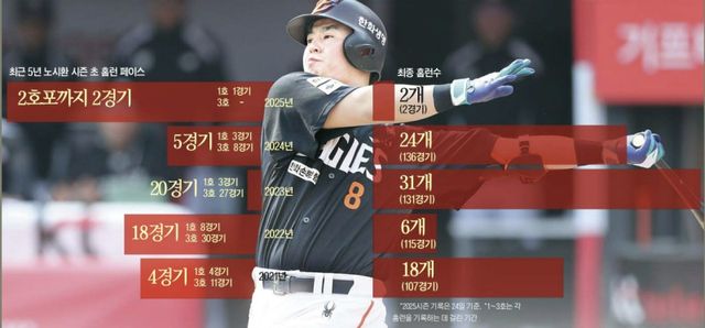 2019년 프로에 데뷔한 노시환은 지난해까지 개막 시리즈에서 홈런을 때려본 적이 없다. 2021년 한화의 4번 타자로 안착한 그는 2023년엔 홈런왕(31개)도 수상했다. 그러나 발동이 늦게 걸리는 편이었다. 2023년 첫 홈런은 3경기 만에 나왔지만, 2호 포까지는 20경기가 걸렸다. 3호 홈런은 정규시즌 개막 후 27경기만에 터졌다. 지난해에는 8경기 만에 3호 포를 때렸지만, 이 기간 타율(0.207)이 낮았다.