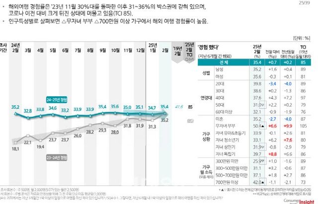 26일 컨슈머인사이트가 발표한 ‘2월 국내·해외 여행동향’ 조사에 따르면, 국내 숙박여행 경험률은 62.5%로 지속적인 감소세를 보이는 반면 해외여행 경험률은 35.4%로 일정 수준을 유지하고 있는 것으로 나타났다. 이 같은 경험률 차이는 소비 심리 변화와 여행 비용 부담 증가 등이 주요 원인으로 분석했다.