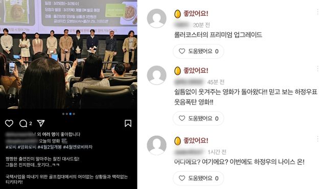 또한 “ <롤러코스터> 의 프리미엄 업그레이드”(CGV_이***), “하정우 감독의 유쾌하고 호탕한 유머! 날카로운 현실 풍자도 최고”(CGV_김코***), “쉴 틈 없이 웃겨주는 영화가 돌아왔다! 믿고 보는 하정우 표 웃음폭탄 영화!”(CGV_설레***), “어디예요? 여기에요? 이번에도 하정우의 나이스 온!”(CGV_Jad***), “예상을 빗나가는 스토리와 숨가쁜 텐션에 자기 전에 누우면 생각날 것 같아요”(CGV_Jin***) 등 하정우 스타일의 코미디와 생동감 넘치는 쫀쫀한 대사에 대한 만족감을 드러내며 올봄 최고 기대작이 탄생했음을 입을 모아 극찬, 반드시 영화관에서 관람할 것을 추천했다.