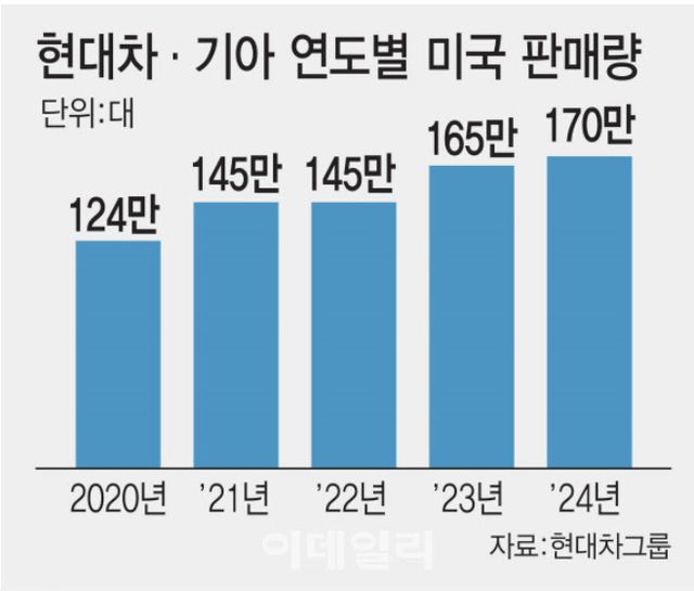 120만대 체제가 구축되면 현대차·기아가 지난해 미국에서 판매한 약 170만대 규모의 차량 수요 중 상당 부분을 현지 생산으로 충당하는 셈이다. 현지 생산 비중이 53%에서 70%로 늘어난다.