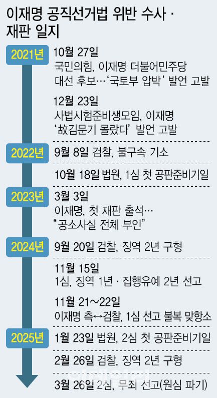서울고법 형사6-2부(부장판사 최은정 이예슬 정재오)는 26일 이 대표의 공직선거법 위반 혐의 사건 항소심 선고기일을 열고 무죄를 선고했다. 검찰은 “최종심인 대법원에서 항소심의 위법을 시정할 수 있도록 조치할 예정”이라며 즉시 상고 의사를 밝혔다. 그러나 대법원 확정 판결까지는 수개월이 걸릴 전망이다. 선거법의 경우 대법원은 2심 선고가 이뤄진 날로부터 3개월 내에 결론을 내도록 하고 있다. 오는 6월 26일까지는 대법원 확정 판결이 나와야 하는 셈이다. 다만 이 규정은 훈시 규정으로 여겨지고 있다. 실제 이 대표의 이번 2심 선고는 지난해 11월 15일 1심 선고가 있은 지 4개월 11일 만에 나왔다.