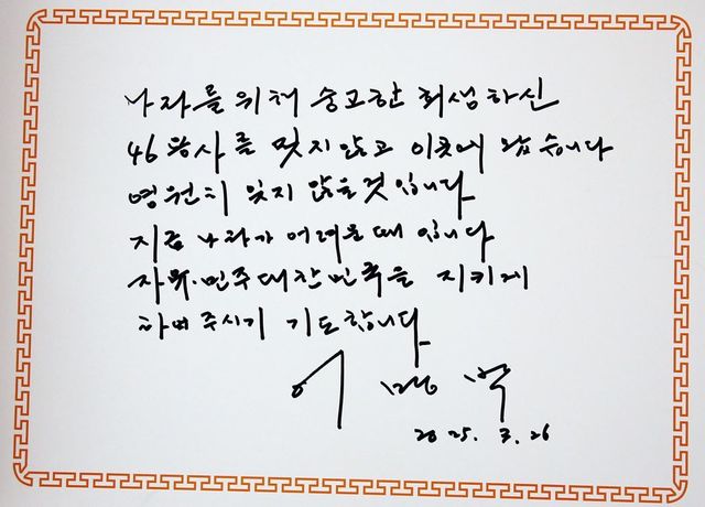 이 전 대통령은 현충탑에 참배를 마치고 방명록에 "나라를 위해 숭고한 희생하신 46용사를 잊지 않고 이곳에 왔습니다. 영원히 잊지 않을 것입니다"라며 "지금 나라가 어려울 때입니다. 자유·민주 대한민국을 지키게 하여주시기를 기도합니다"라고 남겼다.