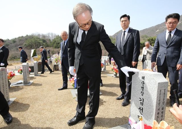 이 전 대통령은 천안함 46용사 묘역을 참배하고 묘석을 하나하나 어루만졌다.