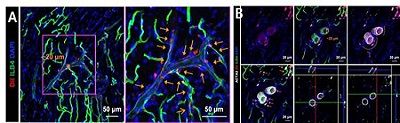 [그림2 : A.조직 내 세포 추적을 통해 rSMC(red)가 혈관(green)벽 안으로 정착하는 능력 확인해 rSMCs가 단순히 모양만 비슷한 것이 아니라, 실제로 혈관 벽에서 평활근세포로서 역할을 수행할 수 있는 것을 확인했다. B. 조직 내 세포 추적을 통해 rSMC(red)가 세동맥의 혈관 벽(white)안으로 정착하는 능력을 확인했다.]