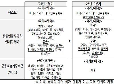 2025년 2분기 중점검역관리지역에는 페스트의 경우 기존 마다가스카르, 콩고민주공화국에 더해 중국 내몽골자치구가 추가됐다.