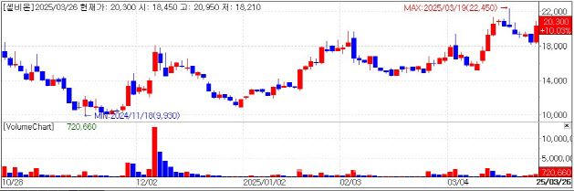 On March 21, CellBion shares closed at 20,300 won, up 1,850 won or 10.03%, according to KG Zeroin’s MP Doctor (formerly Market Point).