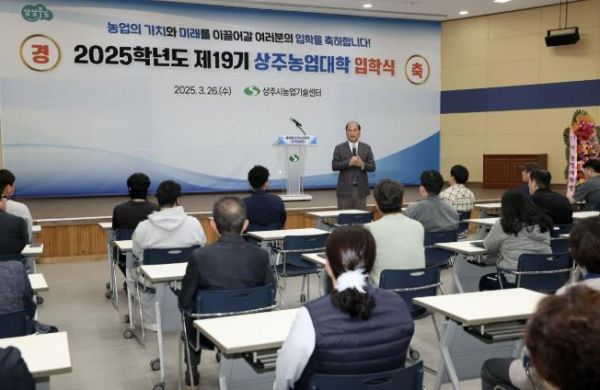 [한국미디어뉴스통신 박말희 기자] 상주시농업기술센터는 3월 26일에 2025학년도 제19기 상주농업대학 ‘양액재배과’ 입학생 40명과 축하와 격려를 위한 내빈 및 관계관이 참석한 가운데 농업기술센터 대강당에서 입학식을 개최했다.