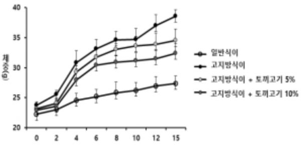 연구 결과, 토끼고기를 포함한 고지방 식이군이 토끼고기를 포함하지 않은 단순 고지방 식이군에 비해 체중 증가가 유의미하게 억제된 것이 확인됐다. 실험 초기(0주)에는 모든 실험군의 체중이 유사한 수준이었으나, 토끼고기를 포함한 고지방 식이군의 체중 증가가 점진적으로 억제됐다. 특히 토끼고기를 10% 포함한 식이군이 5%를 포함한 식이군보다 체중 증가가 더욱 둔화했다.