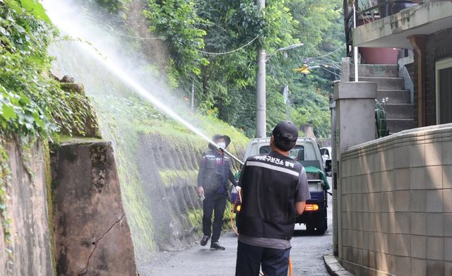 2022년 7월 4일 서대문구에서 보건소 관계자들이 '러브버그' 방역 작업을 하고 있다. / 연합뉴스