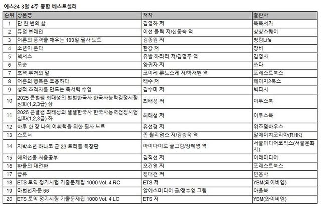 이처럼 이번 주 베스트셀러 순위는 신간과 스테디셀러, 종이책과 전자책을 가리지 않고 다양한 콘텐츠가 고르게 주목받은 흐름을 보여줬다. 특히 김영하라는 이름이 증명하듯, 문학은 여전히 많은 이들에게 위로와 용기를 건네는 존재임을 다시금 확인하는 시간이었다.