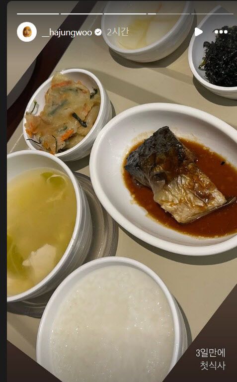 하정우는 27일 자신의 사회관계망서비스(SNS)에 “3일 만에 첫 식사”란 문구와 함께 사진 스토리 게시물을 올렸다.