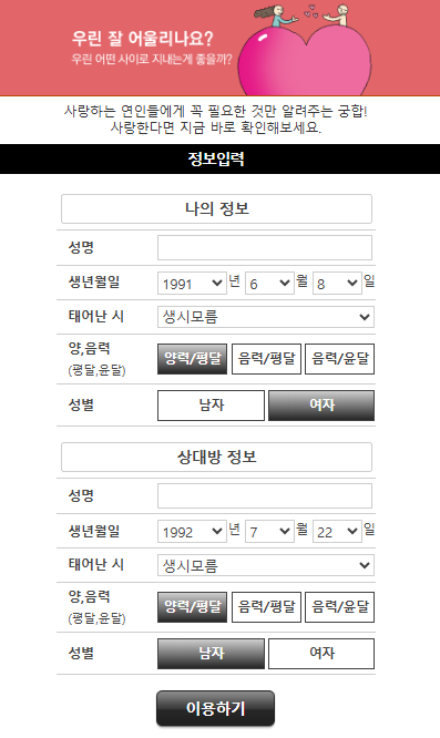위키사주의 궁합 서비스인 '우린 잘 어울리나요?'는 사주팔자를 기반으로 두 사람의 성향과 조화를 분석하여 궁합을 무료로 제공하는 시스템이다. 생년월일과 성별만 입력하면 두 사람의 오행, 기운, 성격적 특징 등을 분석하여 관계의 조화를 평가해준다. 궁합 결과는 텍스트로 제공되며, 상세한 해설을 통해 두 사람의 관계를 더욱 깊이 이해할 수 있다.