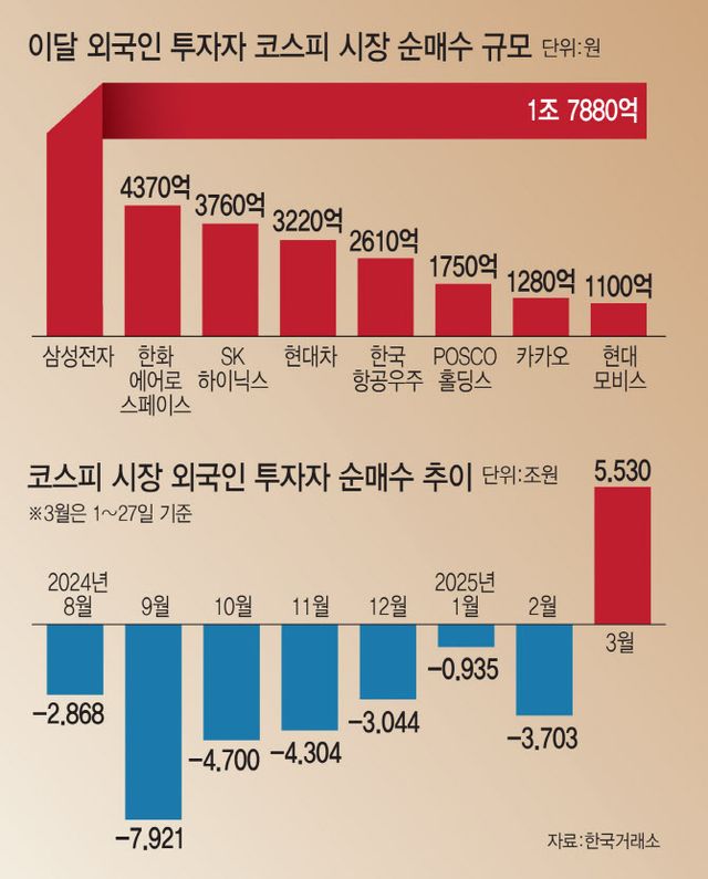 삼성전자 외 외국인 투자자의 순매수세는 한화에어로스페이스(4370억원), 현대차(3220억원), 한국항공우주(2610억원), 현대모비스(1110억원), 기아(970억원) 등 방산 및 자동차 업종의 시가총액 상위 종목에 집중됐다.