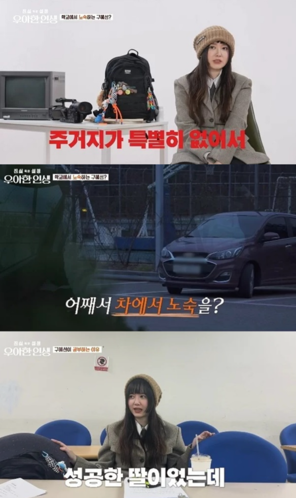 이번 예능 프로그램을 통해 공개된 그녀의 근황은 많은 이들에게 충격을 주었다. 시험기간이었던 그녀는 학교 주차장에 주차된 자신의 차량에서 일어나는 모습으로 등장했다.