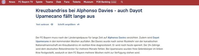뮌헨 구단은 지난 26일(한국시간) 구단 공식 홈페이지를 통해 "알폰소 데이비스가 십자인대 파열을 당했다. 다요 우파메카노 또한 장기 결장할 것이다"라고 공지했다.