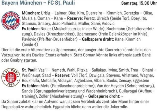 뮌헨은 다가오는 29일 독일 뮌헨에 있는 알리안츠 아레나에서 열리는 2024-2025시즌 분데스리가 27라운드 장크트 파울리와 홈 경기를 치른다. 독일 매체 '키커'는 뮌헨의 리그 27라운드 경기 예상 선발 명단을 공개하면서 김민재를 선발 명단에 올렸다.