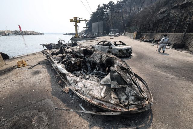 산불은 바다 위까지 덮쳐, 영덕군 노물리 항구에 정박했던 어선 12척도 형체를 알 수 없을 정도로 불에 탔다.