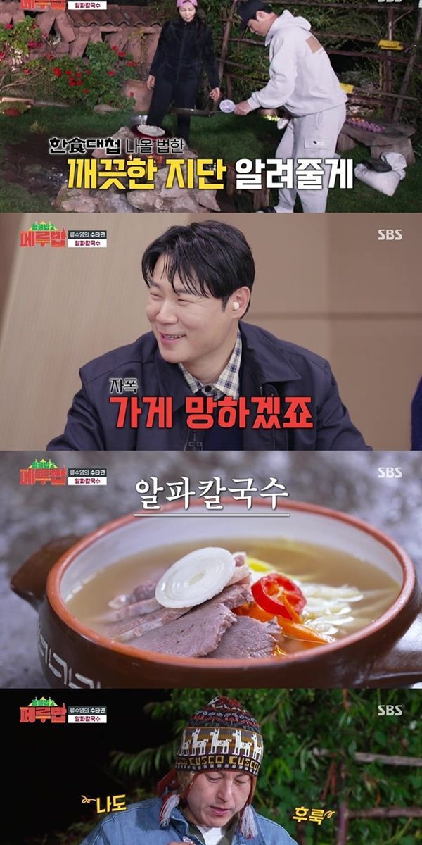 류수영은 갈비탕 같은 고기 육수로 진한 국물 맛을 낸 알파카 칼국수를 멤버들에 대접했다. 염전 ‘맛벌이’ 노동에 녹다운 상태가 된 최현석도 류수영표 국수에 감탄을 금치 못했고, 김옥빈은 얇은 지단으로 완벽한 마무리를 선보였다.