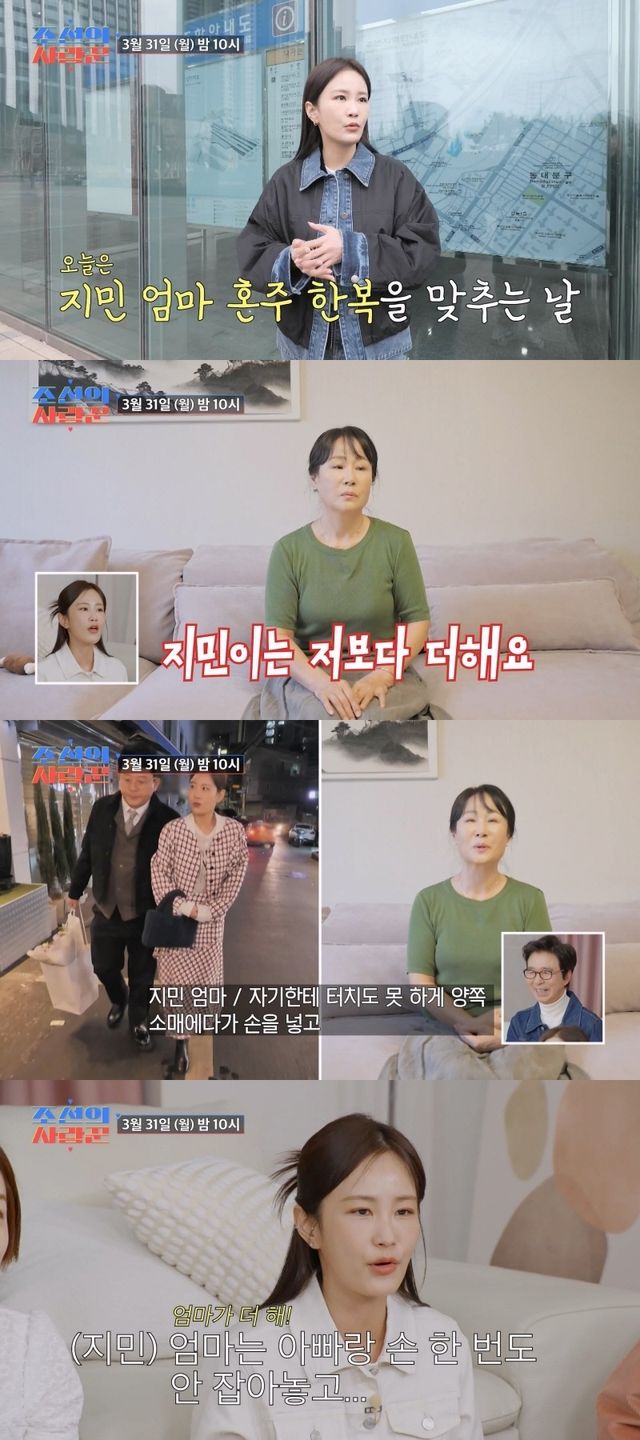 31일 방송되는 TV CHOSUN ‘조선의 사랑꾼’에서는 김지민이 동해에서 올라온 엄마를 마중 나간다. 김지민은 "엄마가 혼주 한복 피팅을 아직 안 했다. 오늘 곱게 차려입은 모습을 봐 드리면 좋을 것 같다"며 기대감을 전했다.