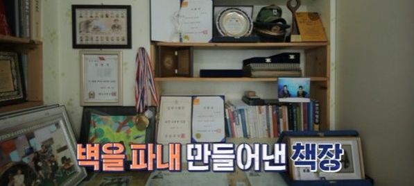 입사 시절 받은 롤링페이퍼와 아나운서 시험을 보던 시절 시험표 등이 보관돼 있었다. 펵을 파내 만들어진 책장이 눈에 띄었다.