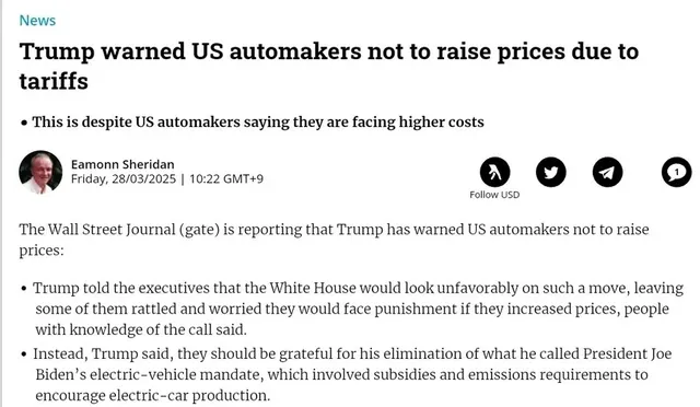 • 트럼프 대통령이 미국 자동차 회사들에게 관세에도 불구하고 가격 인상을 자제할 것을 경고하며, 가격 인상 시 백악관의 불이익과 처벌 가능성을 언급했습니다.
