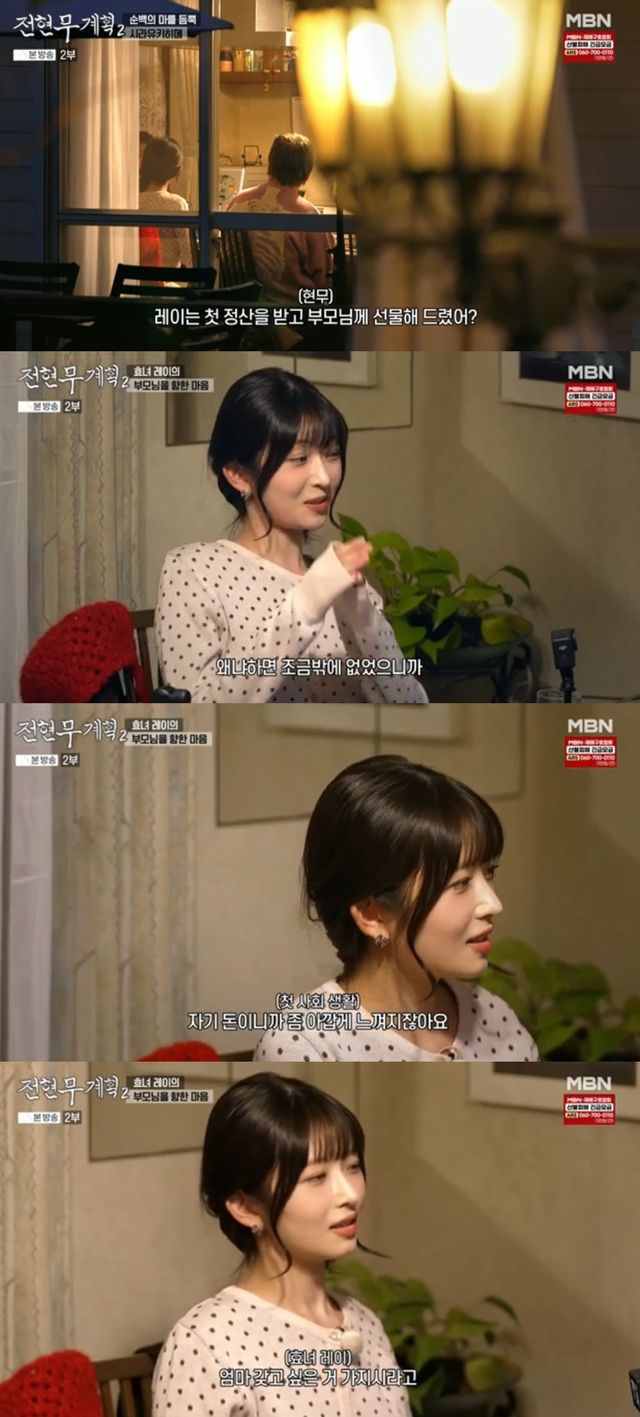 이날 전현무는 “레이는 첫 정산을 받고 부모님께 선물해 드렸냐”고 물었고, 레이는 “처음에 받았을 때는 바로는 못 썼다. 조금 쌓였을 때 다 드렸다”고 말했다.