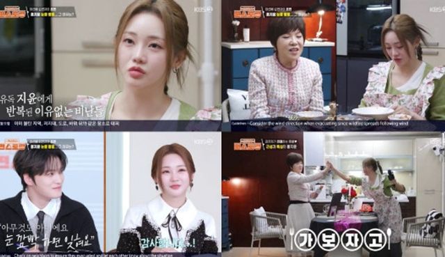 한편 두 사람의 진솔한 대화도 공개됐다. 김연자는 홍지윤에게 “연애하니?”라고 물었다. 또 본인은 “남자친구 있고, 결혼 생각은 없고”라며 현실판 ‘아모르파티’의 주인공임을 밝혔다. 이어 김연자는 평소 홍지윤의 무대를 보며 느낀 점을 이야기했는데 홍지윤은 “저 들으라고 욕하시는 분들이 있었다. 그런 일을 겪은 후 무대 공포증이 생겼다”라고 눈물을 뚝뚝 흘리며 고백했다.