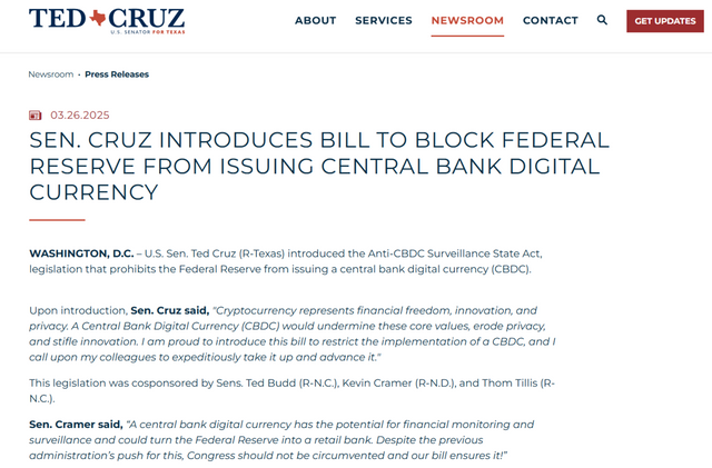 테드 크루즈 미국 상원의원은 연준이 CBDC와 관련한 제품·서비스를 미국인에게 제공하지 못하도록 하는 ‘CBDC감시금지국가법’을 발의했다. /출처=테드 크루즈 의원 홈페이지